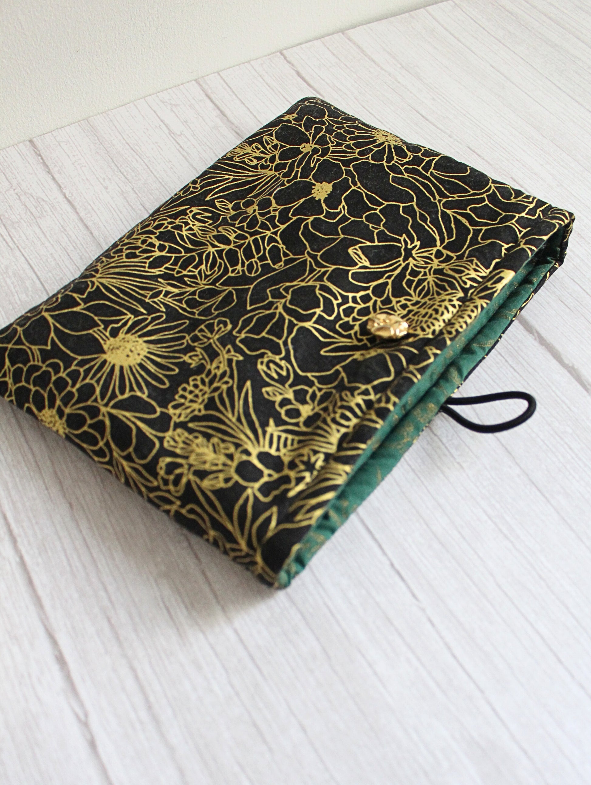 Lined with a complementary green and gold fabric, the sleeve features a secure elastic and button closure, with a vintage gold flower button that adds a touch of timeless charm. The outer fabric and lining are double-stitched for extra durability, ensuring your book sleeve will withstand everyday use.