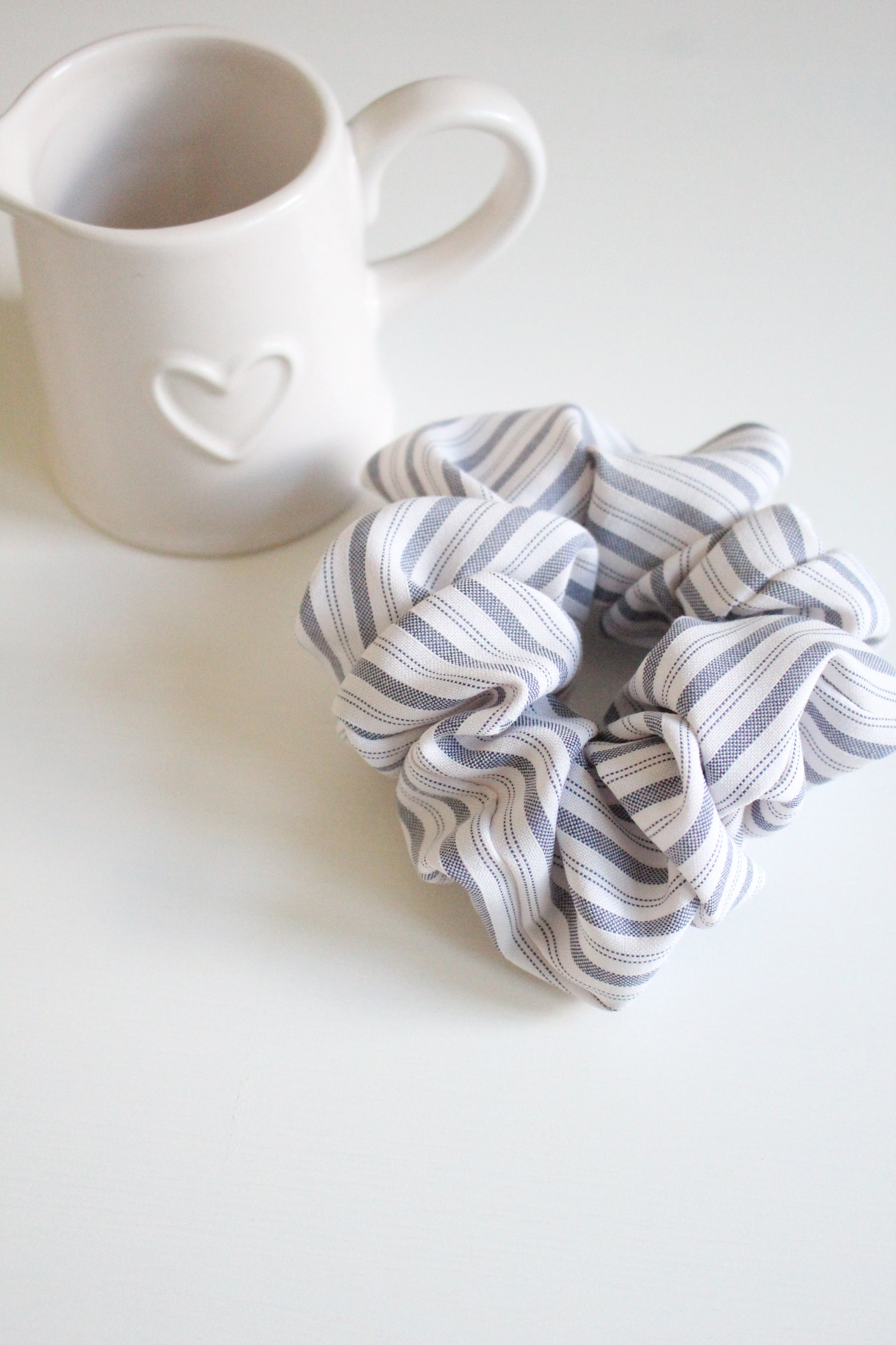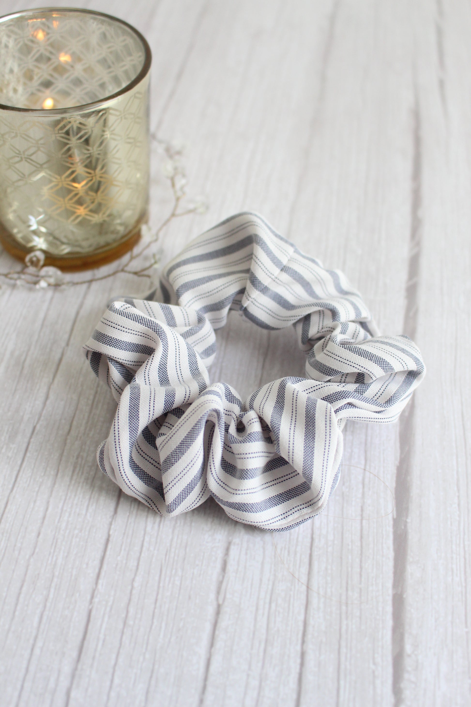 This beautiful hair scrunchie is handmade from high-quality cotton with a blue and white stripe pattern. Each scrunchie is one-of-a-kind, made with carefully selected fabric and hand sewn closed for a high quality finish.