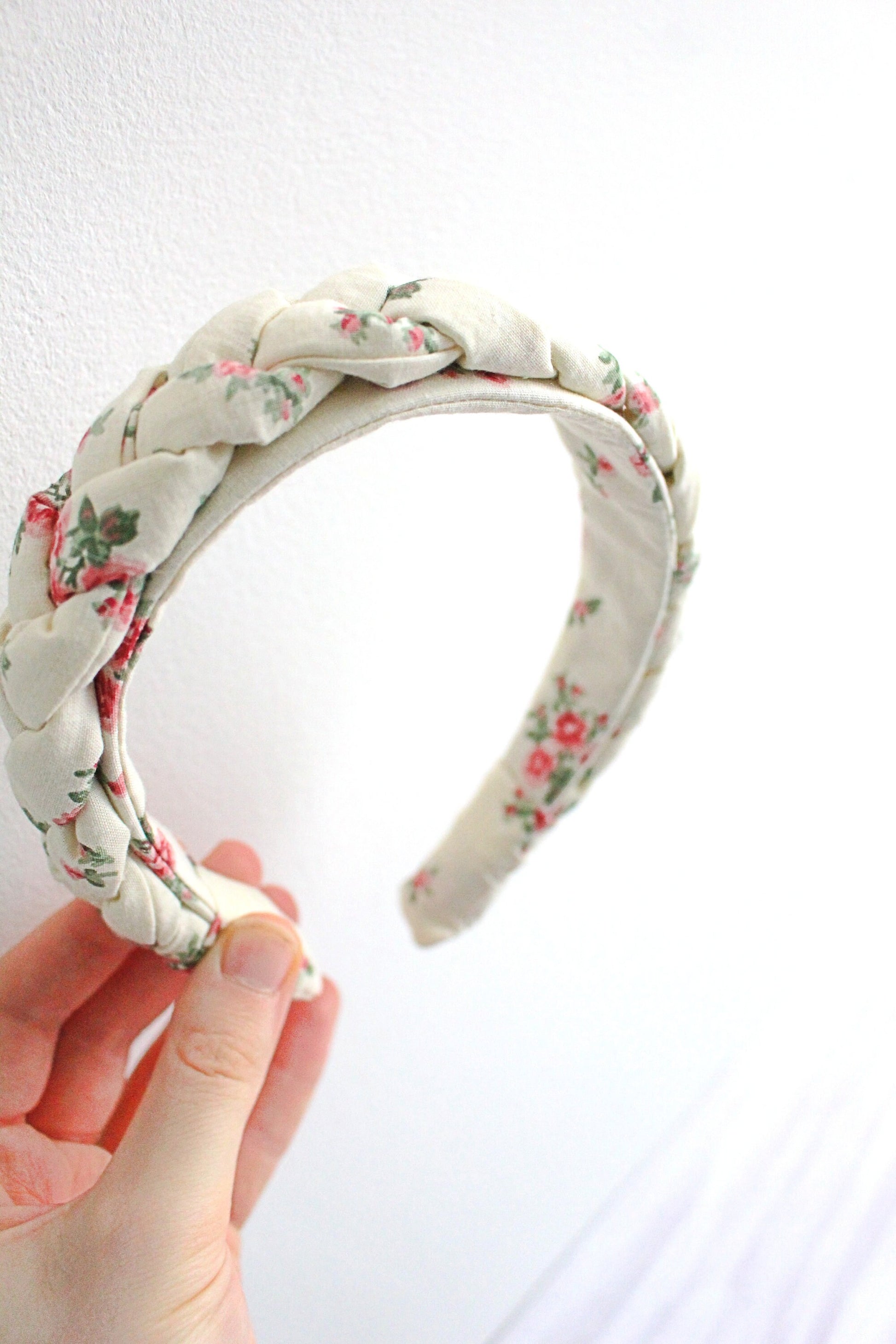 Vintage floral fabric braided hairband. Fabric has a beautiful print with a dainty pink floral pattern.