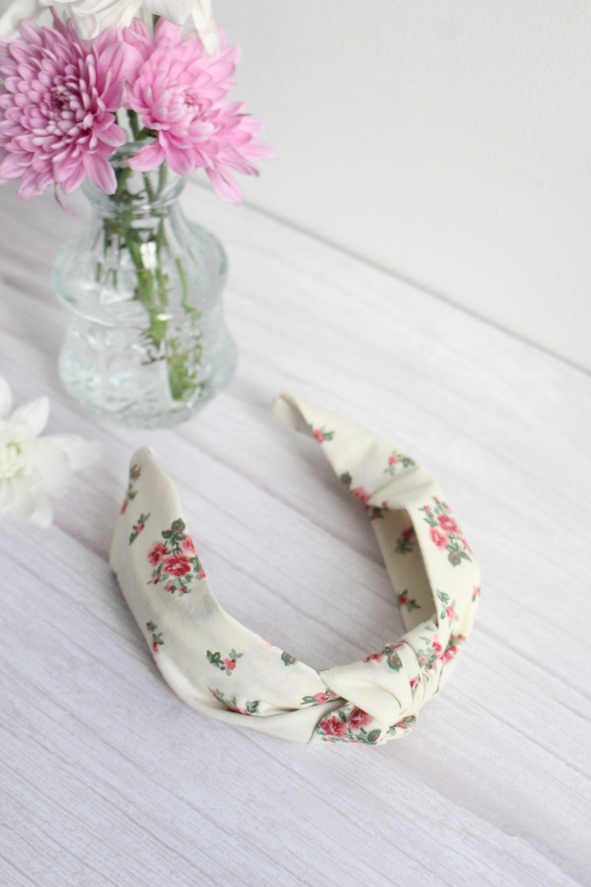 Vintage floral fabric knotted hairband, the fabric has a beautiful print with dainty, pink florals.