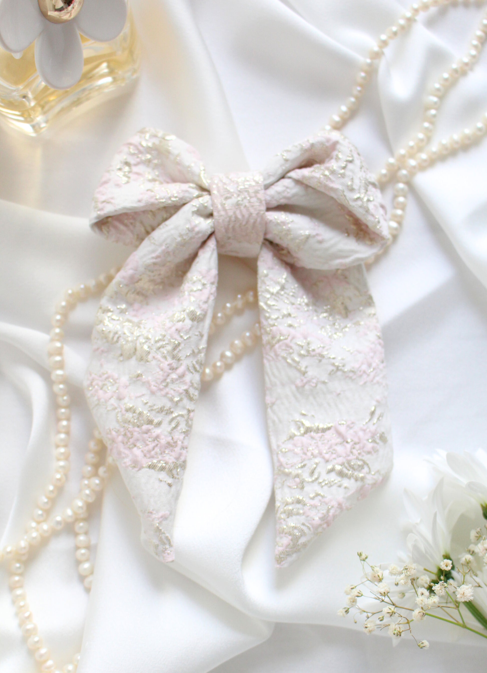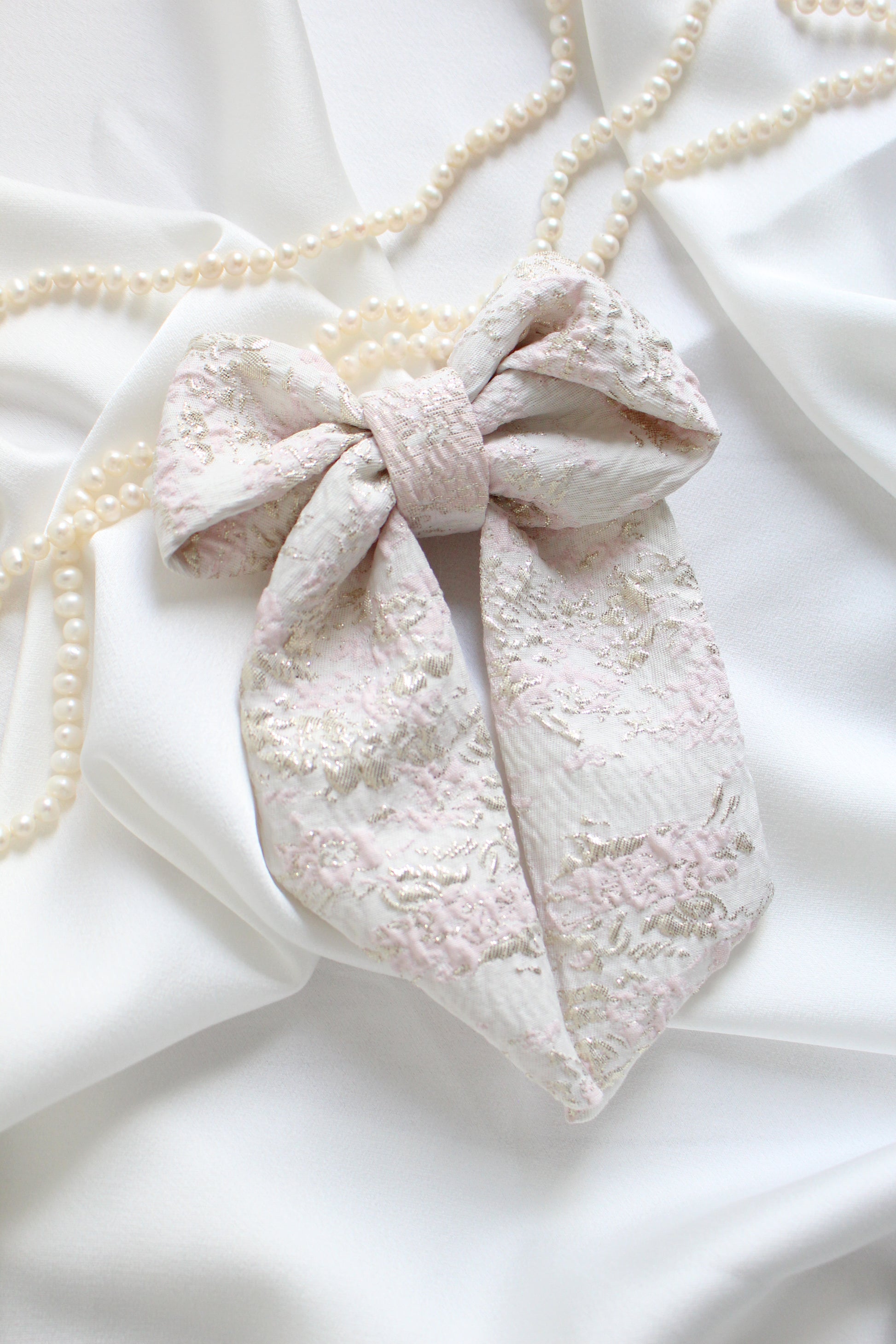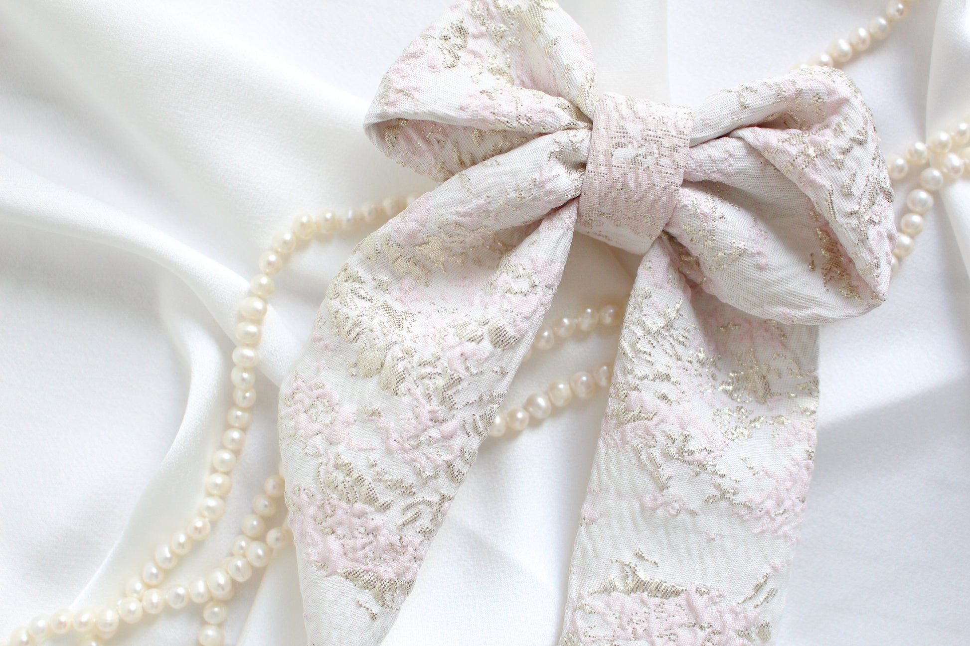 Crafted from luxurious pink, cream, and gold jacquard fabric, this bow measures 13cm in width and 21cm in height, creating a perfect balance of delicate yet eye-catching style. Made with remnant fabric, it offers a chic, environmentally conscious accessory for any occasion.