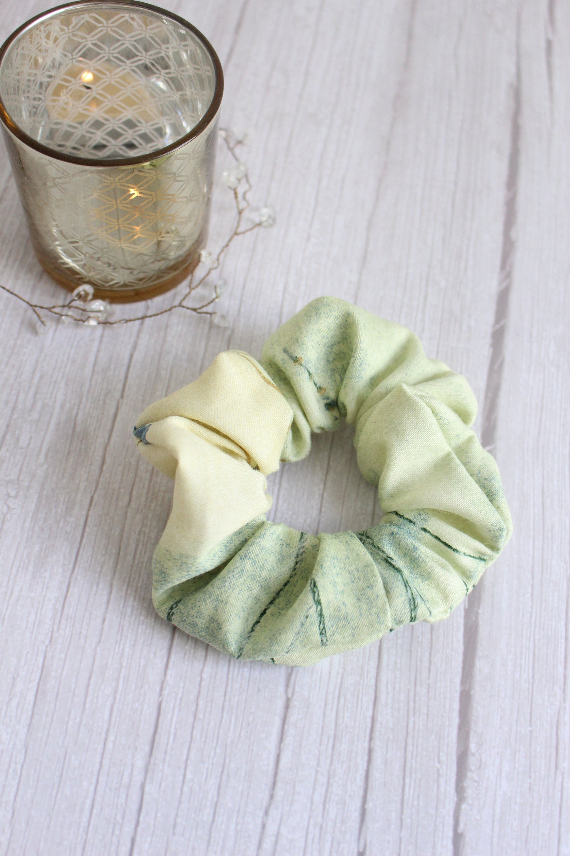 Regular sized hair scrunchie in a sage green and cream, soft cotton fabric. Made with thin elastic and measuring approximately 12cm in diameter.